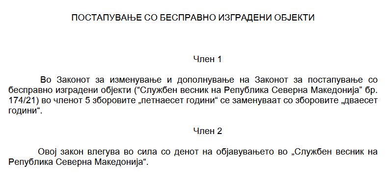 Владејачкото мнозинство во Собранието поднесе предлог-закон за изменување на Законот за постапување со бесправно изградени објекти со кој наместо 15, рокот за легализација на објектите со ваков статус да изнесува 20 години.