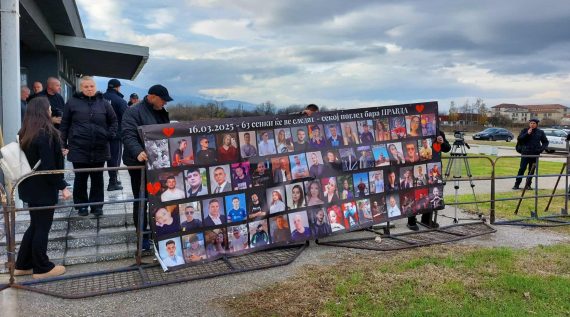Транспарентот на кој над фотографиите на загинатите стои натпис „16.03.2025 – 63 сенки ќе ве следат – … Продолжи со читање Продолжува судeњето за „Пулс“ – родителите на загинатите дојдоа со транспарент пред судницата
