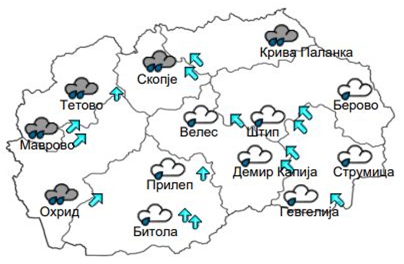 Во Скопје, исто така, ќе биде облачно со повремени врнежи од дожд кои во делови од котлината повремено ќе бидат пообилни. Ќе дува умерен, а во делови од скопската котлина и засилен ветер од јужен правец. Дневната температура во главниот град ќе се искачи до 14 Целзиусови степени.