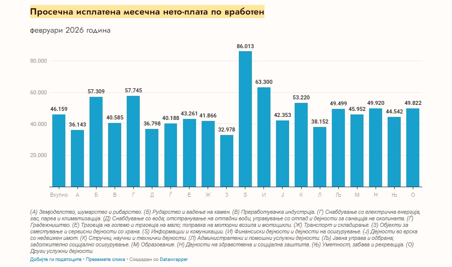 На графиконот објавен на веб-страницата на ДЗС може да се види дека највисока просечна исплатена месечна нето-плата по вработен има во секторот информации и комуникации и таа изнесува 86 013 денари. По нив се финансиските дејности и дејности на осигурување каде просечната нето-плата е 63 300 денари. Трет сектор е градежништвото каде висината на платата била 57 745 денари.
