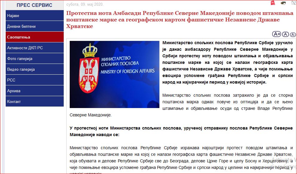 „Министерството за надворешни работи на Србија го искажува својот најостар протест против печатењето и објавувањето на поштенска марка со географска карта на фашистичката Независна држава Хрватска, во која се вклучени делови од Република Србија се до Белград, делови од Црна Гора и цела Босна и Херцеговина, а чие споменување евоцира спомени на граѓаните на Србија и на српскиот народ како целина во најтемниот период во поновата историја. Ваквите обиди за историски ревизионизам грубо ги нарушуваат билатералните односи меѓу Србија и Северна Македонија, како и соработката и стабилноста во целиот регион“,