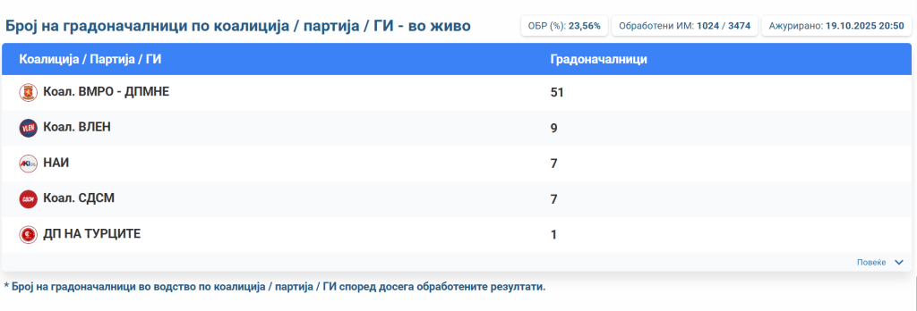 Државната изборна комисија ги објави првичните неофицијални резултати по пребројани 23,56% од избирачите, за изборите за градоначалници. … Продолжи со читање Првичните резултати на ДИК: ВМРО-ДПМНЕ води во 51 општина, ВЛЕН во 9, НАИ во 7, СДСМ во 7 и ДПТ во 1