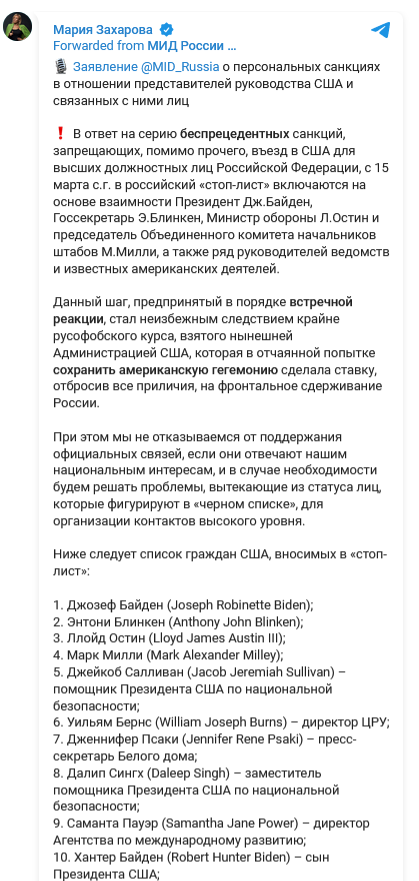 „Како одговор на низа санкции без преседан од 15 март годинава, руската ‘стоп-листа’ врз основа на реципроцитет ги вклучува претседателот Џозеф Бајден, државниот секретар Ентони Блинкен, министерот за одбрана Лојд Остин и претседателот на генералштабот Марк Мајли, како и на многубројни шефови на институции и познати американски личности“,