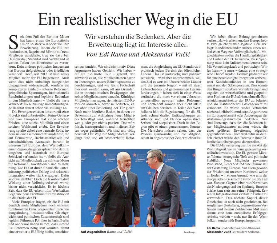 Ова го напишаа албанскиот премиер Еди Рама и српскиот претседател Александар Вучиќ во заедничкото писмо што го објави германскиот весник „Франкфуртер Алгемајне Цајтунг“. Во писмото, двајцата балкански лидери, чии земји се кандидати за членство во Европската унија и се во фаза на преговори, велат дека ништо не ја променило ЕУ по падот на Берлинскиот ѕид како проширувањето со нови членки, и ниту еден друг политички процес не ја трансформирал Европа подлабоко и помирно. Според нив, тоа помогнало да се воспостави демократија, стабилност и просперитет во поголемиот дел од европскиот континент.