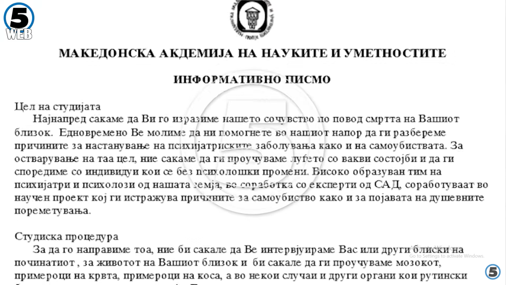 Во документите за случајот што професорот од Универзитетот „Колумбија“, Горазд Росоклија, ги доставил до Канал 5, меѓу другото, е и примерок од информативното писмо што им се испраќало на семејствата на починатите со кое се бара нивна согласност за учество во интервју, како и согласност за донација на мозочно ткиво од починатиот. Во документот, меѓу другото, се наведува дека учеството е доброволно и дека органите и крвта на починатите нема да бидат употребени во истражувањето без нивна согласност