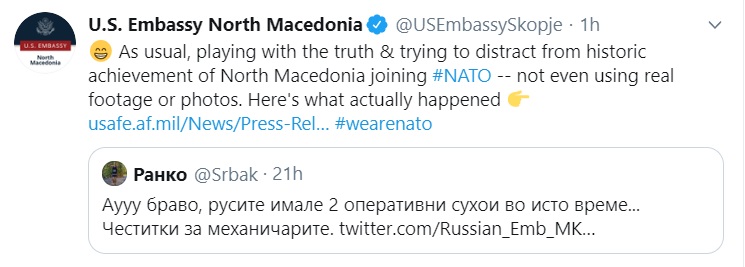 Реагираше Амбасадата на САД: Како и обично, си поигруваат со вистината и се обидуваат да го одвлечат вниманието од историското зачленување на Северна Македонија во НАТО – дури не користат ни вистински снимки или фотографии
