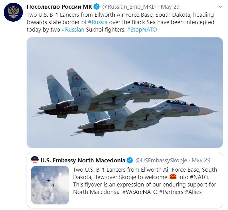 По овој настан кој скопјани можеа лично да го посведочат, Амбасадата на Русија во земјава објави пораката на „Твитер“ во која пишува дека два руски авиони „сухои“ над Црно море пресретнале два американски авиони од воената база во Јужна Дакота, кои се движеле кон руската границата. Објавата е проследена со видео, фотографии и хаштаг „СтопНАТО“. Во прилог е постиран твитот на Амбасадата на САД за прелетот на двата американски бомбардера над Скопје.