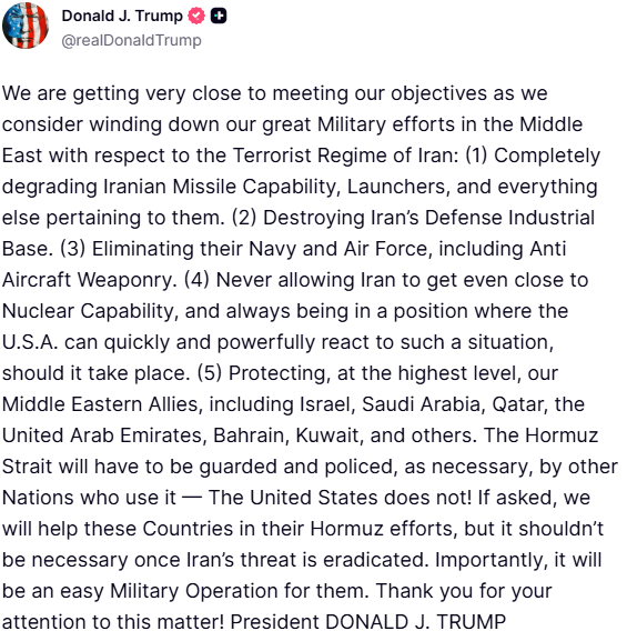 „Ормутскиот теснец ќе мора да биде чуван и контролиран, по потреба, од други нации кои го користат – САД не го прават тоа! Доколку се побара, ние ќе им помогнеме на овие земји во нивните напори за Ормуз, но тоа не би требало да биде потребно откако заканата од Иран ќе биде искоренета. Важно е што тоа ќе биде лесна воена операција за нив“,