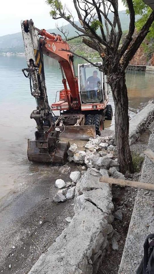 Бетонскиот ѕид поставен на брегот на Охридското Езеро на плажата Градиште од утринава се урива. Градоначалникот на Охрид, Константин Георгиески, на Фејсбук сподели фотографии од кои се гледа градежна механизација која ги отстранува остатоците од „парапетчето“.