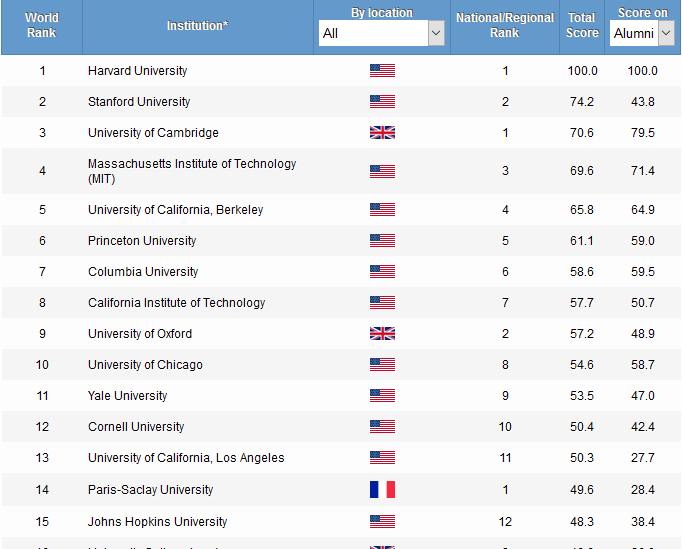 Критериумите вклучуваат: број на добитници на Нобелова награда меѓу поранеши студенти, број на истражувачи кои најмногу се споменуваат во нивните дисциплини и број на публикации во специјализираните списанија Science и Nature.