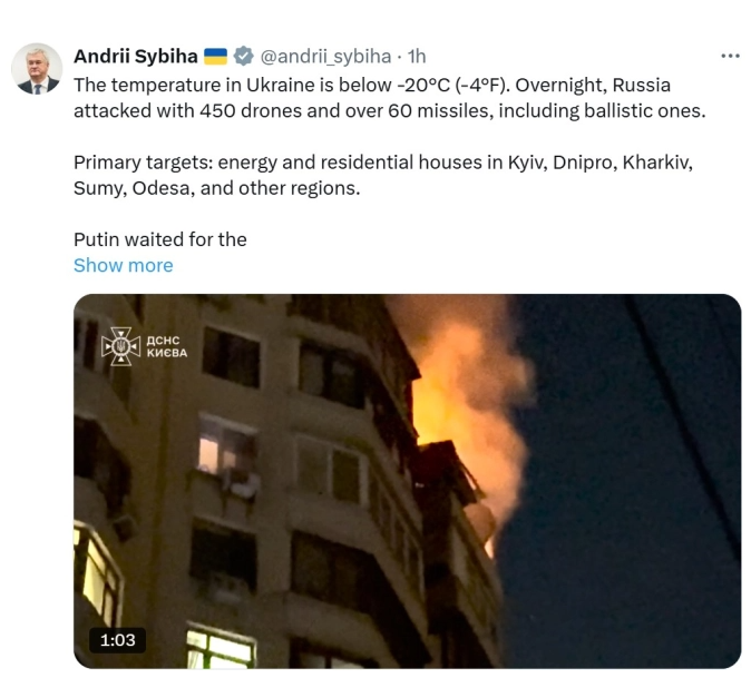 Температурата во Украина е под минус 20 Целзиусови степени, а Русија нападна со 450 беспилотни летала и над 60 ракети преку ноќ, вклучувајќи балистички, енергетски објекти и станбени згради во Киев, Днепар, Харков, Суми, Одеса и други региони, изјави украинскиот министер за надворешни работи, Андриј Сибиха.