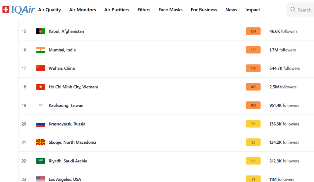 Од европските градови зад Скопје се Амстердам , Сараево и Белград, додека на светско ниво најзагаден воздух дишат жителите на Лахор (Пакистан), Делхи (Индија) и Карачи (Пакистан).