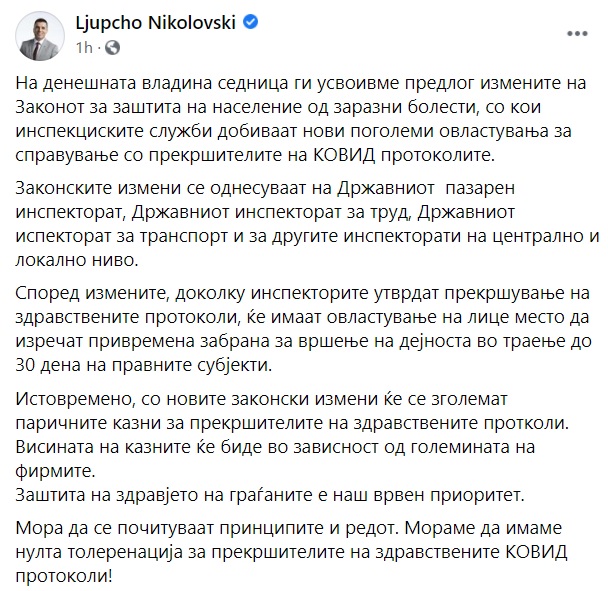 „Законските измени се однесуваат на Државниот пазарен инспекторат, Државниот инспекторат за труд, Државниот испекторат за транспорт и за другите инспекторати на централно и локално ниво. Според измените, доколку инспекторите утврдат прекршување на здравствените протоколи, ќе имаат овластување на лице место да изречат привремена забрана за вршење на дејноста во траење до 30 дена на правните субјекти“,