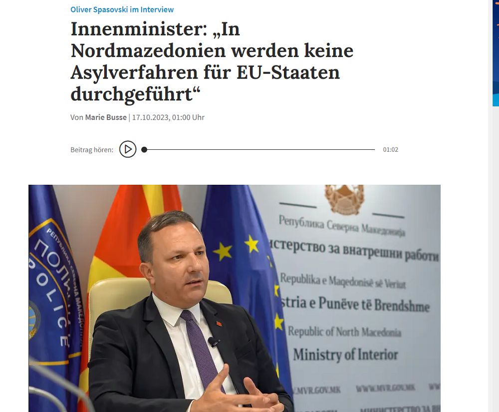„Нашиот став е многу јасен: во Северна Македонија не се спроведуваат процедури за азил за другите земји на ЕУ и тоа нема да се промени. Ако Северна Македонија стане дел од Европската Унија, тоа би можело да се промени. Сè додека тоа не е случај, таквите центри остануваат исклучени“,