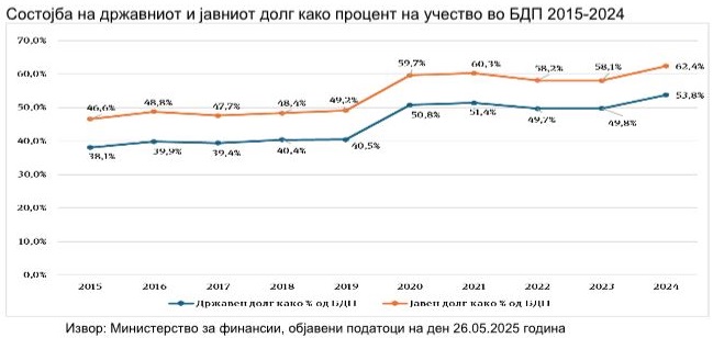 „Состојбата на јавниот долг во однос на БДП на 31.12.2024 година изнесува 62,4% и зголемен е во однос на 2023 година кога истиот изнесуваше 58,1%“,
