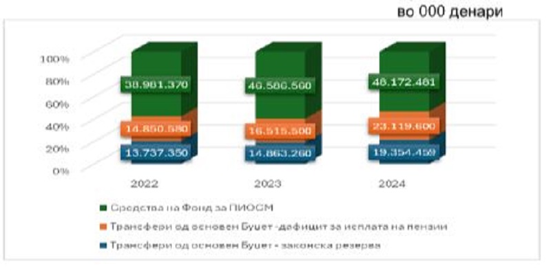 „Вкупните расходи за исплата на пензии во 2024 година во однос на 2023 година бележат зголемување за 16,27%, како резултат на извршеното усогласување на пензиите на 01.03.2024 година од 5,3%, на линеарното зголемување на пензиите од 2.500 денари почнувајќи од 01.09.2024 година, како и на приливот на нови корисници на пензија“,