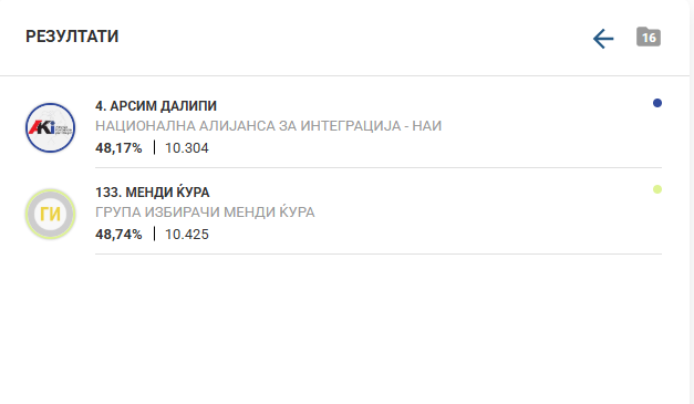 Како што покажуваат резултатите на ДИК од обработени 87,13 отсто од избирачките места, разликата меѓу двајцата кандидати е 120 гласа во полза на Ќура, односно, Далипи има освоено 10 304 гласа, а Ќура 10 425 гласа.