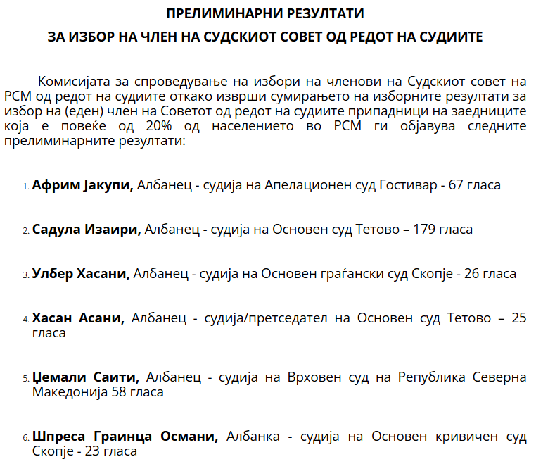„Напоменувам дека ова се прелиминарни резултати, поради тоа што тече рокот за приговори од пет часа. За конечниот резултат во текот на утрешниот ден ќе биде објавено соопштение на страницата на Судскиот совет“,