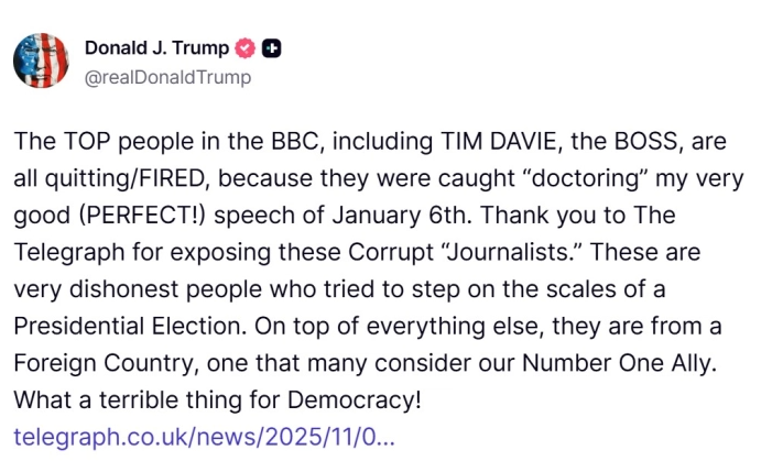„Највисоките луѓе во Би-би-си, вклучувајќи го и Тим Дејви, шефот, сите даваат отказ/се отпуштаат, бидејќи беа фатени како го ‘фалсификуваат’ мојот многу добар (совршен) говор од 6 јануари. Благодарност до Телеграф за разоткривањето на овие корумпирани ‘новинари’. Ова се многу нечесни луѓе кои се обидоа да влијаат на претседателските избори. Пред сѐ, тие се од странска земја, земја која многумина ја сметаат за наш сојузник број еден. Каква ужасна работа за демократијата“,