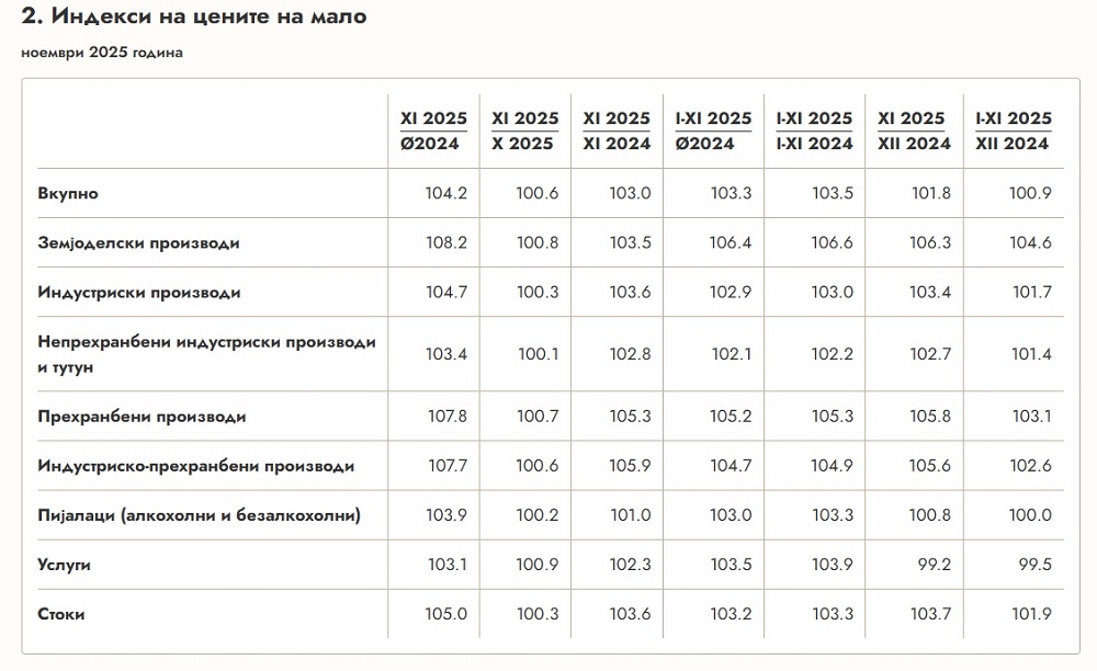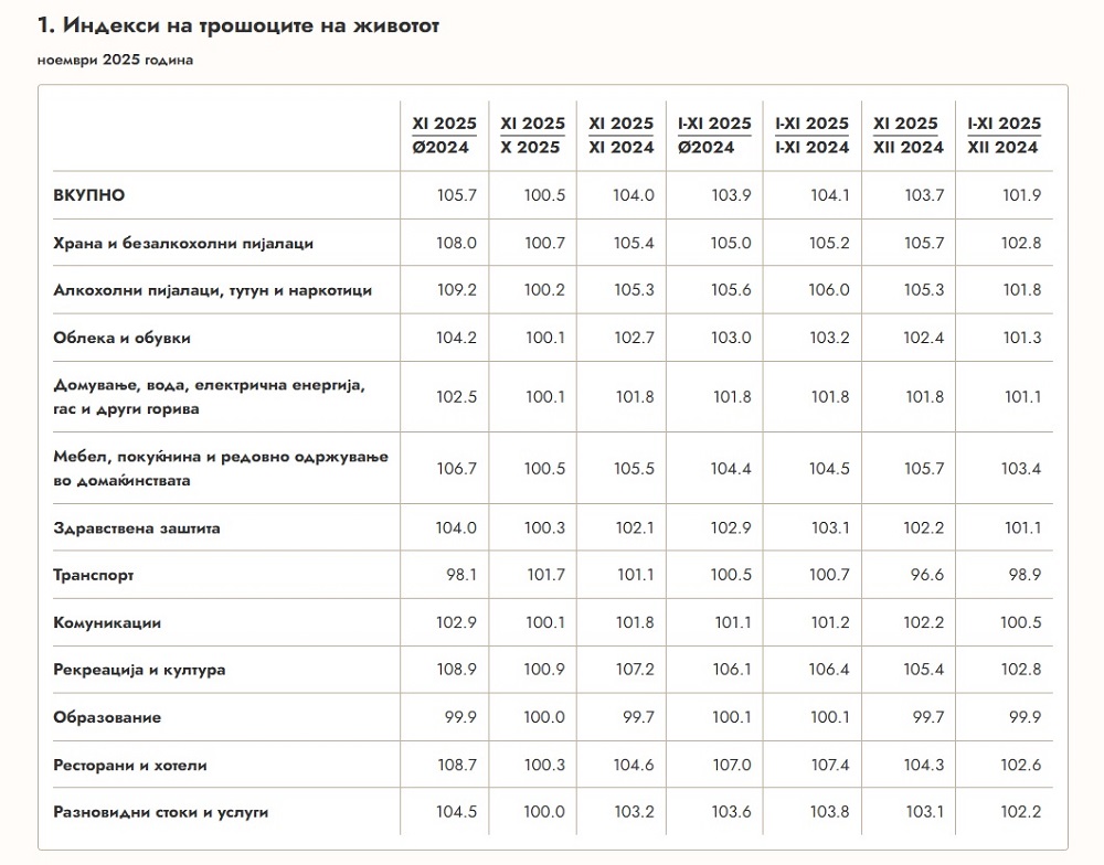 Индексот на трошоците на живот во ноември 2025 година бележи годишно зголемување од четири отсто во однос на истиот месец минатата година. Истовремено, индексот на цените на мало е зголемен за три отсто, покажува најновиот извештај на Државниот завод за статистика (ДЗС).