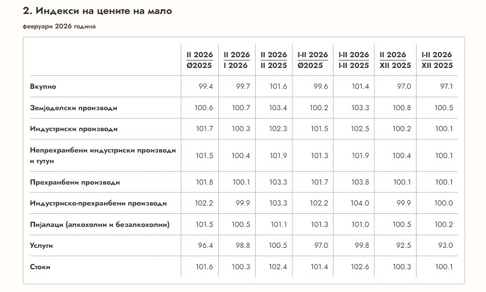Државниот завод за статистика објави и дека индексот на цените на мало во февруари бележи намалување од 0,3 отсто во однос на претходниот месец, а на годишно ниво индексот на цените на мало бележи зголемување од 1,6 проценти