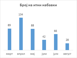 Се забележуваат два брана на набавки, од кои едниот кулминира во април, а другиот кулминира во јули. Најмногу итни договори за заштита од коронавирусот се склучени во април.