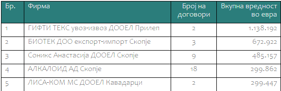 Прва на листата со склучени највредни договори за итни јавни набавки е прилепската фирма „Гифти текс“, за набавка на маски за потребите на министерствата за внатрешни работи и за одбрана. Следни, со позначаен износ на склучените договори, се скопските фирми „Биотек“ и „Соникс Анастасија“, а во првата петорка, но со помали износи, влегуваат и скопски „Алкалоид“ и кавадаречката „Лиса-ком МС“.