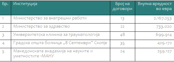 Најголема вредност на склучените договори има МВР, кое склучило 13 договори во вкупна вредност од 2,2 милиони евра, што е дури една третина од вредноста на договорите на сите други институции заедно.