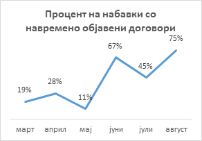 Исто така, институциите ги применуваа и препораките за навремено објавување на склучените договори и за разлика од почетните 19 %, до крајот дури 75 % од договорите беа објавени навремено. Сепак, останатите 25 % од договорите се објавени по законскиот рок од 10 дена по склучувањето на договорот.
