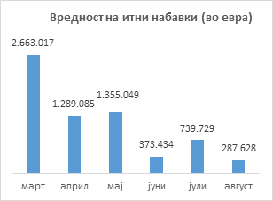 Вкупната вредност на досега склучените договори за јавни набавки преку итната постапка со преговарање без објавување оглас изнесува 413 милиони денари или 6,7 милиони евра. Од март до август годинава се склучени вкупно 447 договори за итни набавки.