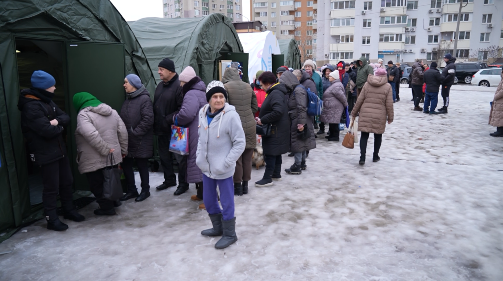 Требаше некако да се стоплат луѓето и беше донесена одлука за поставување на овие шатори. Како што гледате, во овој дел беа отворени две такви точки. Ова се точки за греење каде што луѓето можат да се стоплат, да ги наполнат уредите, да комуницираат. Исто така, организациите обезбедија храна за луѓето. Во една од нашите образовни установи, во училиште, беше организирана народна кујна каде што дојдоа волонтери кои подготвуваа и делеа околу 20 000 оброци неделно.