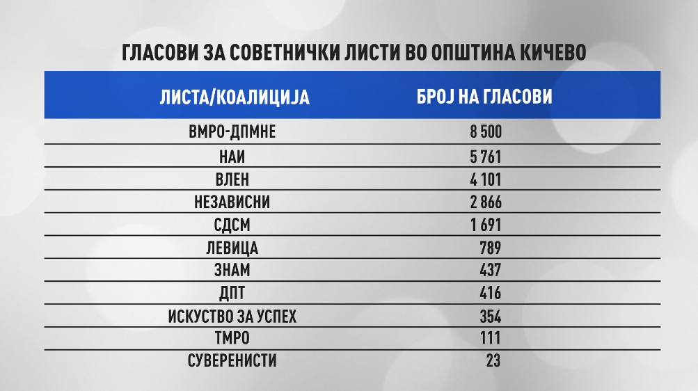 А за кичевци ништо ново, бидејќи истите имиња се најдоа на гласачкото ливче и пред четири години – Александар Јовановски од ВМРО-ДПМНЕ и Фатмир Дехари од ДУИ, односно Националната алијанса за интеграција.
