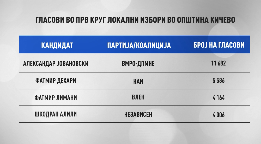 Јовановски, во првиот круг од изборите, освои убедливо најмногу гласови – 11 682. Со околу 6 илјади гласа помалку зад него се најде Фатмир Дехари од НАИ со 5 586. Кандидатот на ВЛЕН, Фатмир Лимани, доби 4 164, а независниот Шкодран Алили заврши со 4 006.