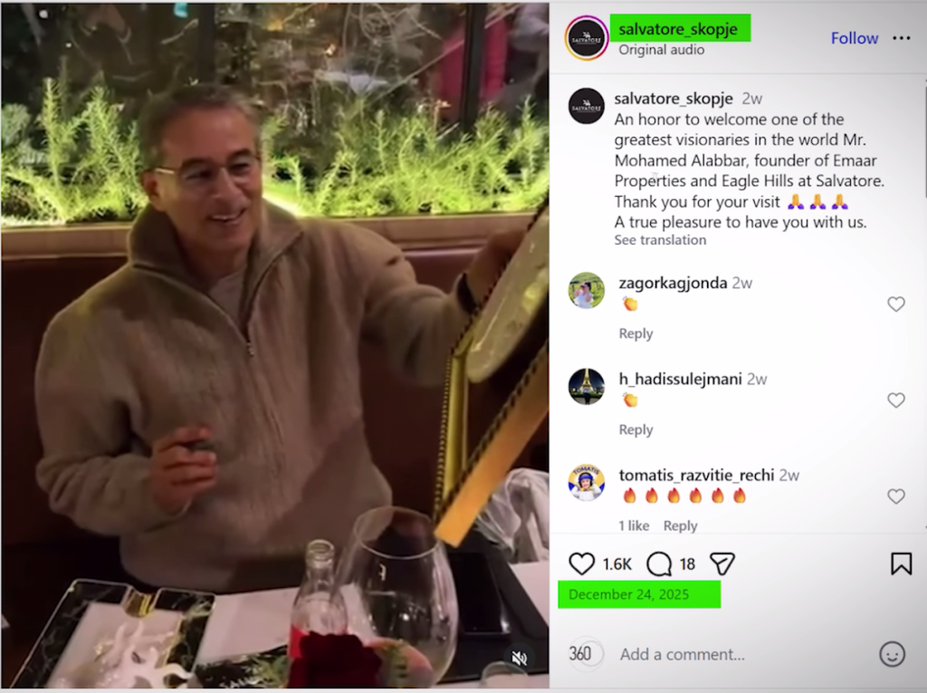На 24 декември, пак, исто така на Инстаграм, видео со Алабар објави ресторанот „Салваторе“ од Скопје. Датумот на чинијата на која бизнисменот остава посвета е 23 декември.
