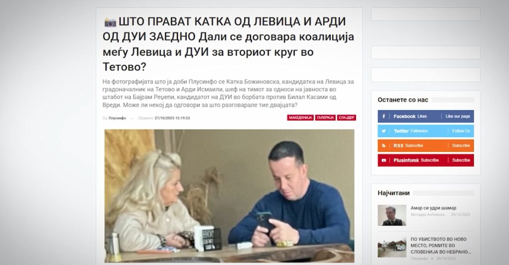 Но, меѓу моментот на снимање на ова интервју со Реџепи и објавувањето на оваа сторија, во јавноста се појави фотографија – кандидатката на Левица за градоначалник на Тетово, Катка Божиноска, во кафуле со човекот задолжен за односи со јавноста на Бајрам Реџепи од ДУИ – Ардит Исмаили.