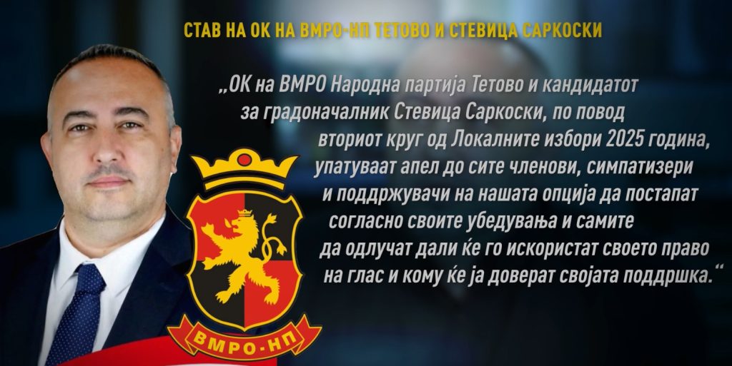 Тетово е една од општините во кои ВМРО-ДПМНЕ не предложи кандидат за градоначалник. Уште во првиот круг ги повика членовите и симпатизерите да гласаат за Билал Касами од ВЛЕН, во обид од прва да го победи ривалот од ДУИ.