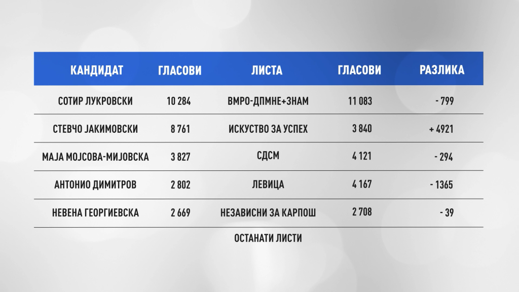 Сотир Лукровски, зад кого стоеја ВМРО-ДПМНЕ и ЗНАМ, освои 799 гласа помалку отколку советничките листи на овие две групации. Стевчо Јакимовски, пак, освои 4 921 глас повеќе отколку што доби советничката листа на коалицијата која го номинираше – „Искуство за успех“. Маја Мојсова-Мијоска доби 294 гласа помалку отколку листата на коалицијата на СДСМ, а Антонио Димитров освои 1 365 гласа помалку од листата на неговата партија – Левица. Само кандидатката Невена Георгиевска освои речиси идентичен број гласови како и листата „Независни за Карпош“. Другите листи, кои немаа свој кандидат за градоначалник, освоија 2 151 глас.