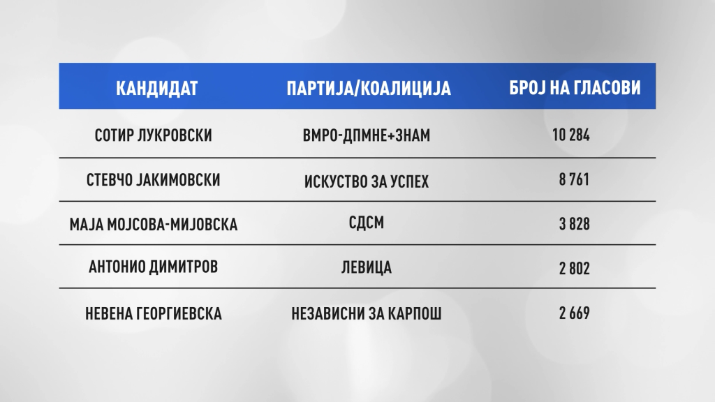 Маја Мојсова-Мијовска од СДСМ, која доби 3 828 гласа, Антонио Димитров од Левица со 2 802 и независната Невена Георгиевска која освои 2 669 гласа. Или тројцата кандидати што отпаднаа од трката тежат 9 299 гласа, кои имаат потенцијал да го одлучат победникот во вториот круг.