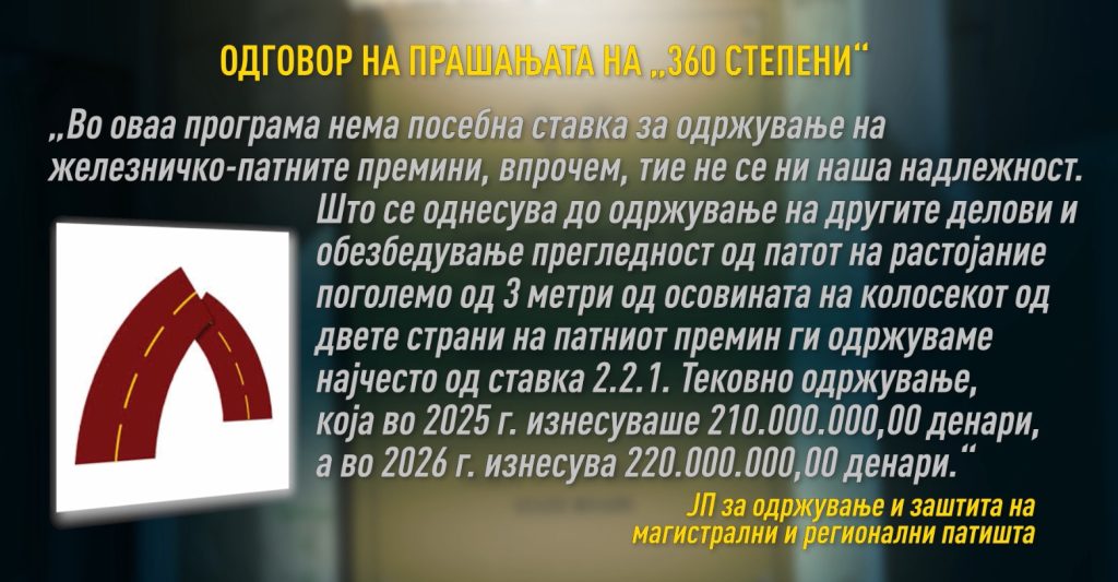 Од Град Скопје, на чија територија се наоѓаат премините во Драчево, не добивме одговор. Ништо повратно немаше и од Зелениково, на чија територија сите премини работеа исправно. Во Јавното претпријатие „Македонија пат“ прашавме дали и колку пари издвоиле во 2025 и во 2026 година за одржување на железничко-патните премини, согласно членот 53 од Законот за железничкиот систем. Ни одговорија дека тие се водат според годишната програма одобрена од Јавното претпријатие за државни патишта.