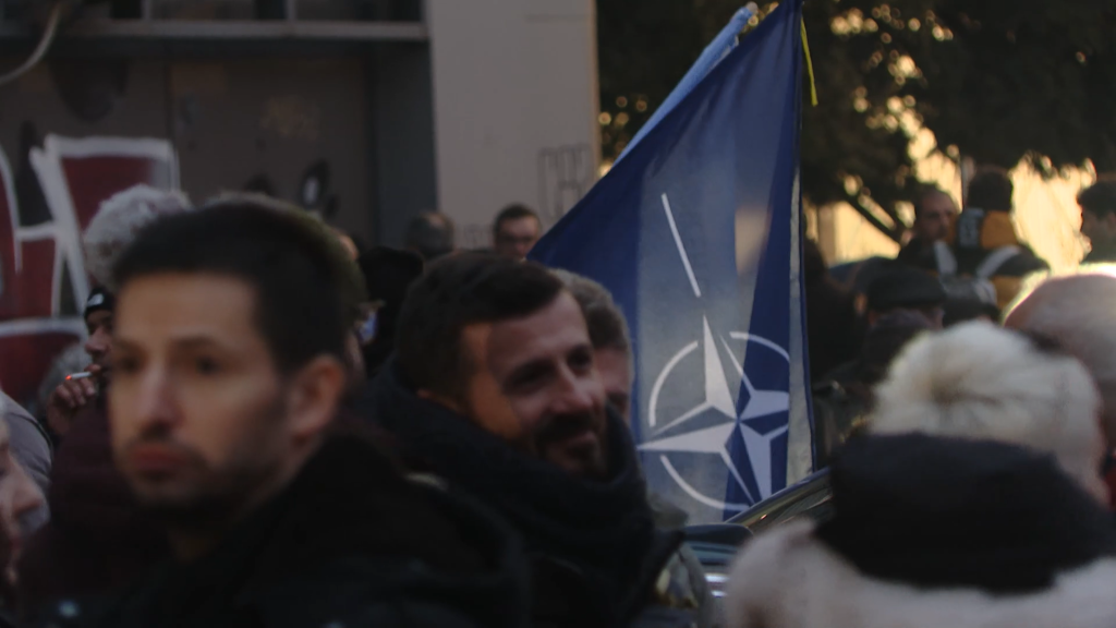 Кореографијата добро позната – знамиња, транспаренти и свирчиња. Веднаш по крајот на работното време, паркингот пред ССМ почна да се полни со работници од целата земја. Меѓу синдикалните знамиња, развиорено беше и она на НАТО.
