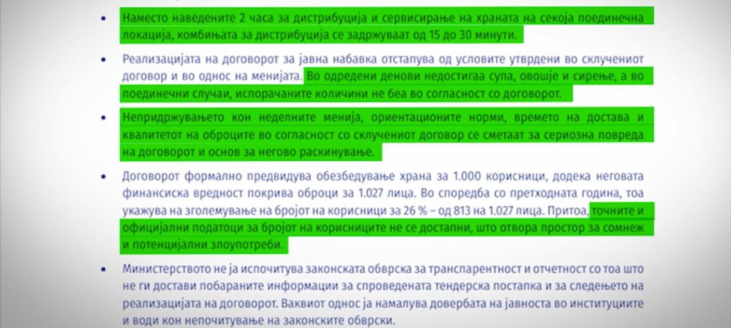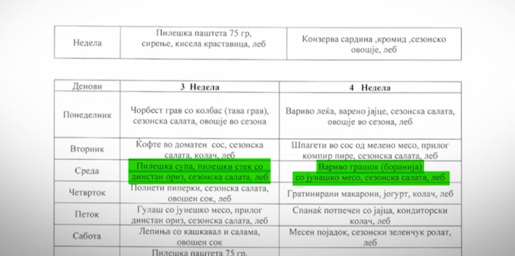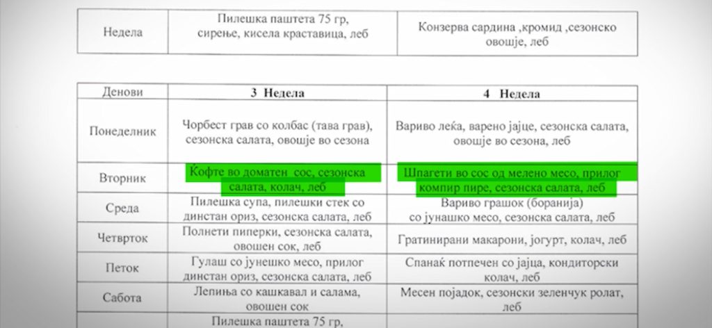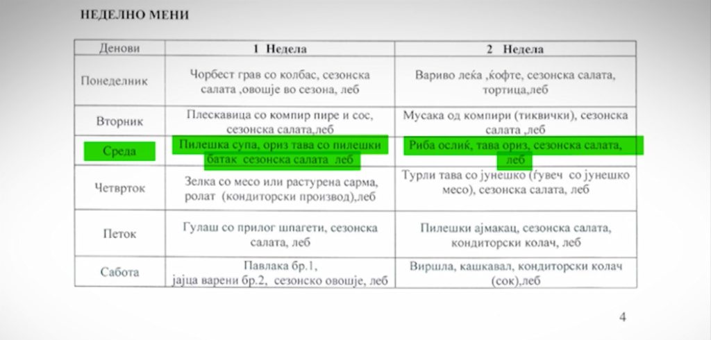 Значи во тендерската документација и во склучениот договор се предвидени менија за секој ден во четири недели, значи опфатен е цел еден месец. И таму е дадена можност да се направи одредена промена во дадени денови, на пример нели наместо јадењето од вторник да може да се даде во среда, и тоа ние низ мониторингот го констатираме. Меѓутоа за тоа да се направи потребно е да се добие дозвола од Министерството за социјална политика, такви докази дека така е постапено не знаеме.