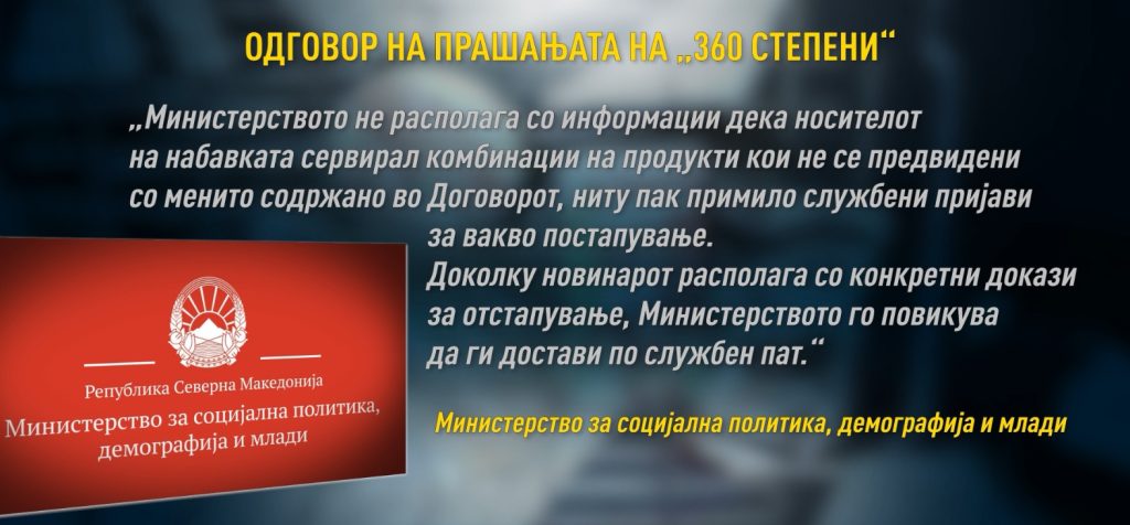 Таков оброк, според договорот склучен меѓу Министерството за социјална политика и приватната фирма „Парти сервис лео“, не постои во менито.
