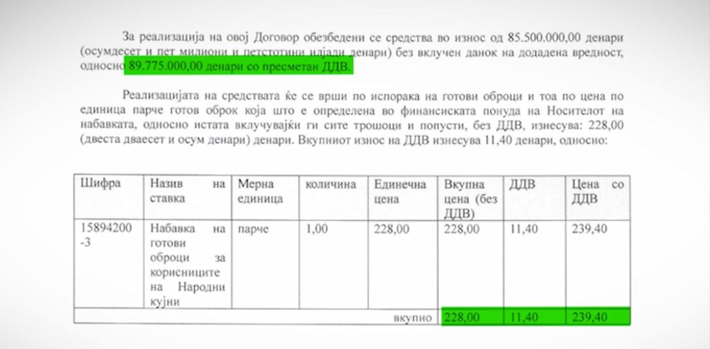 Според склучениот договор, еден оброк државата го плаќа 239 денари со ДДВ. На годишно ниво, државата се обврзува да плаќа до вкупна сума од 1 460 000 евра што претставува 375 000 оброци.