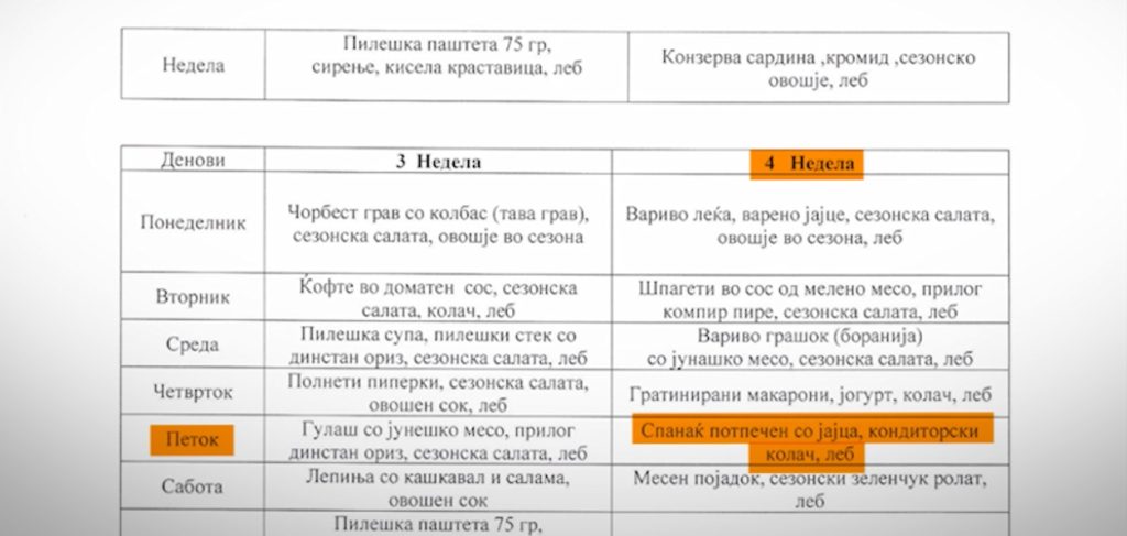 Според менито во договорот, јадењето што го добија корисниците на помошта во вторник, треба да се сервира во еден петок во текот на четири недели.