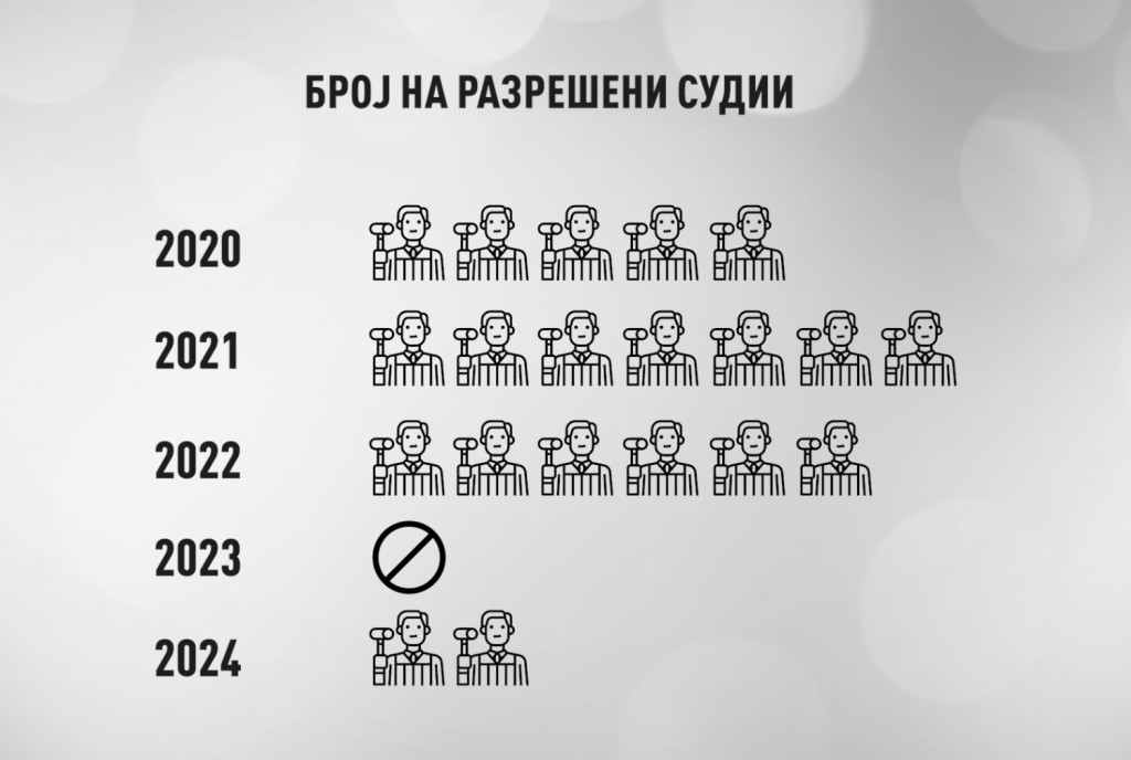 Според годишните извештаи на Судскиот совет, во 2020-та имало пет такви случаи. Во 21-та седум, во 22-та шест, во 23-та ниту еден и во 2024 двајца разрешени судии.