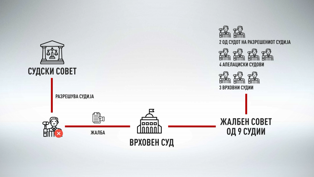 „Судскиот совет е првостепениот орган. Жалбениот совет на Врховниот суд е второстепениот орган којшто одлучува по жалбата. Судот во Стразбур во неколку пресуди укажува дека ефиканоста на правниот лек и двостепеноста на постапката значи правото на Врховниот суд да одлучи мериторно по втората жалба којашто Судскиот совет е должен да ја даде на странката, во случајот судијата.“