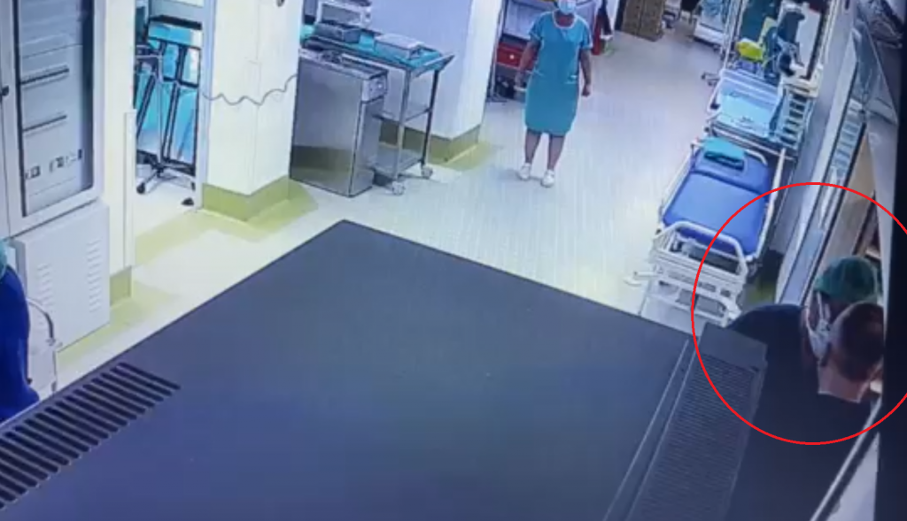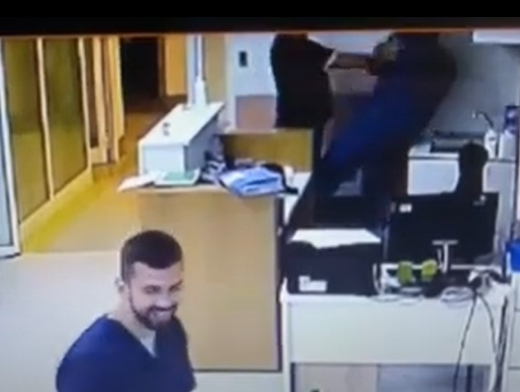 Но, мажот застанува при самиот влез низ електронската лизгачка врата и наскоро можеме да видиме дека таму е пресретнат од д-р Сашко Јовев. Следи разговор од околу 10 секунди, а двајцата на моменти се чини дека се „гради во гради“. На снимката нема тон, па не се слуша што зборуваат, но од аголот од кој е снимено видеото се чини дека нема буткање или удари. Мажот со опремата потоа се враќа од ходникот од каде што дојде, а со него доаѓаат и двете жени кои претходно се чинеше дека ќе влезат во просторијата со него. Јовев се враќа во просторијата зад електронската врата.