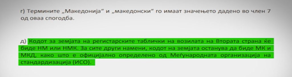 Не беше најважно, но дел од договорот беа и употребата на меѓународните ознаки и кодови. Во членот 1, став 3-д, земјава направи отстапка за ознаката на регистарските таблички на возилата, а Грција се согласи со дотогашниот код за Македонија во сите други случаи.