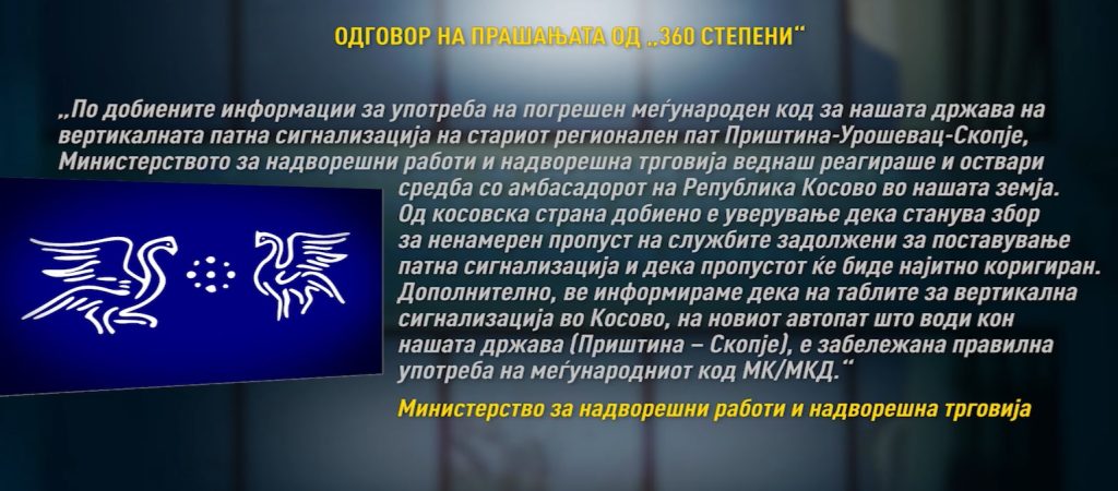 Барајќи став директно во Приштина, дојдовме до информација дека надлежноста за знаците е кај Министерство за животна средина, просторно планирање и инфраструктура на Косово. Успеавме да оствариме телефонска комуникација со директорот на одделот за патишта на Косово, Ќамил Фека. Тој, засега, одби да ни даде став. Од сите остварени комуникации, само неофицијално, дојдовме до информација дека наводно веќе се нарачани нови табли на кои ќе стои меѓународно признатиот ИСО-код за земјава – МК или МКД.