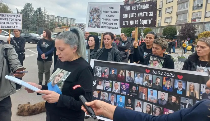 Манта Стојменова, мајка на Спире Стојменов, починат во пожарот имаше 15-минутно обраќање на кружниот тек на улицата „Стево Теодосиевски“, посочувајќи дека им е доста од неказнивост, корупција и од молк.